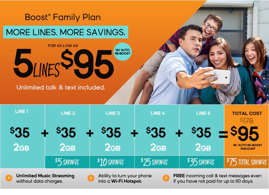 The more lines you add to your boost mobile family plan the cheaper your per line pricing will be more people equals more discounts.